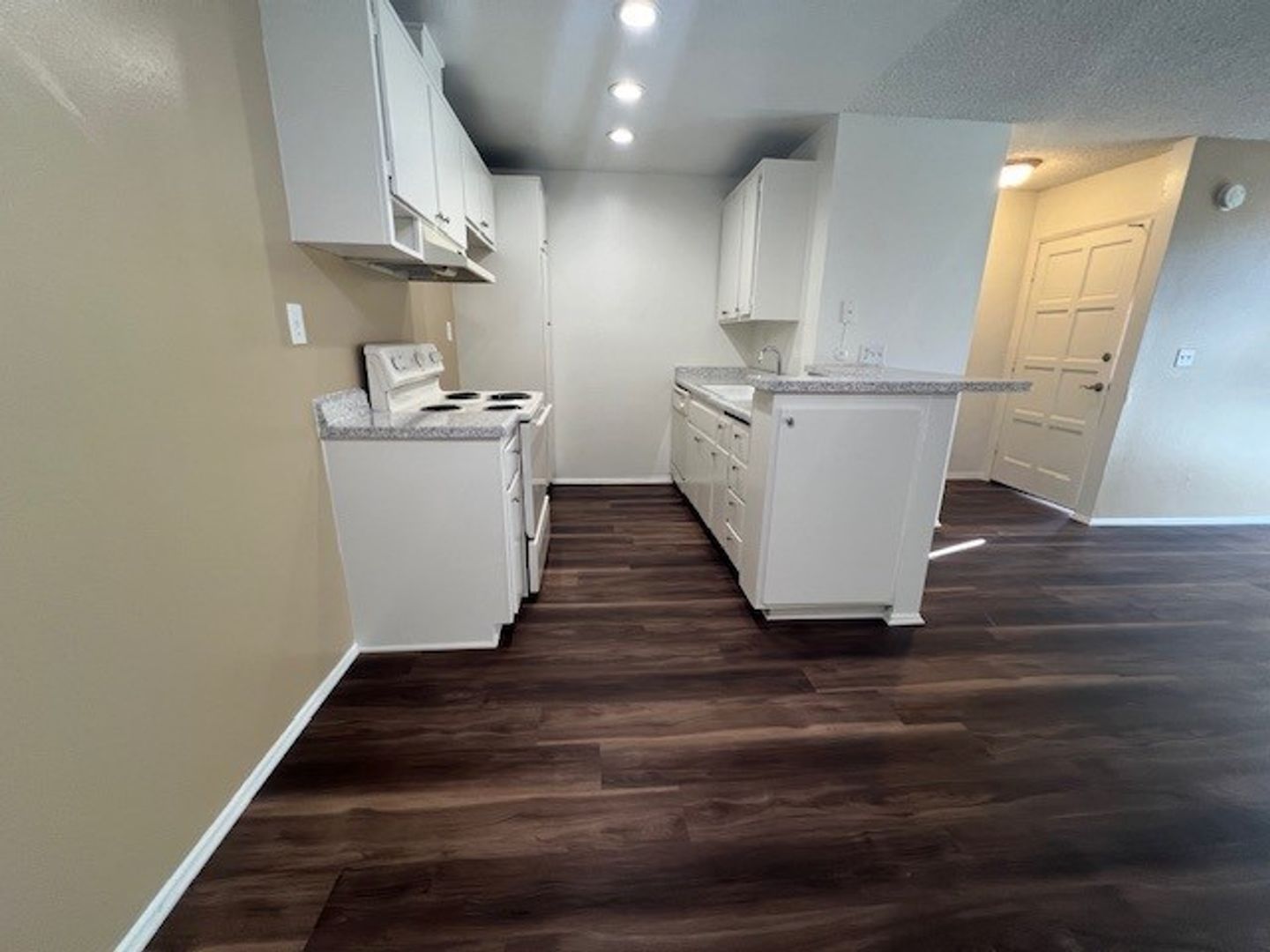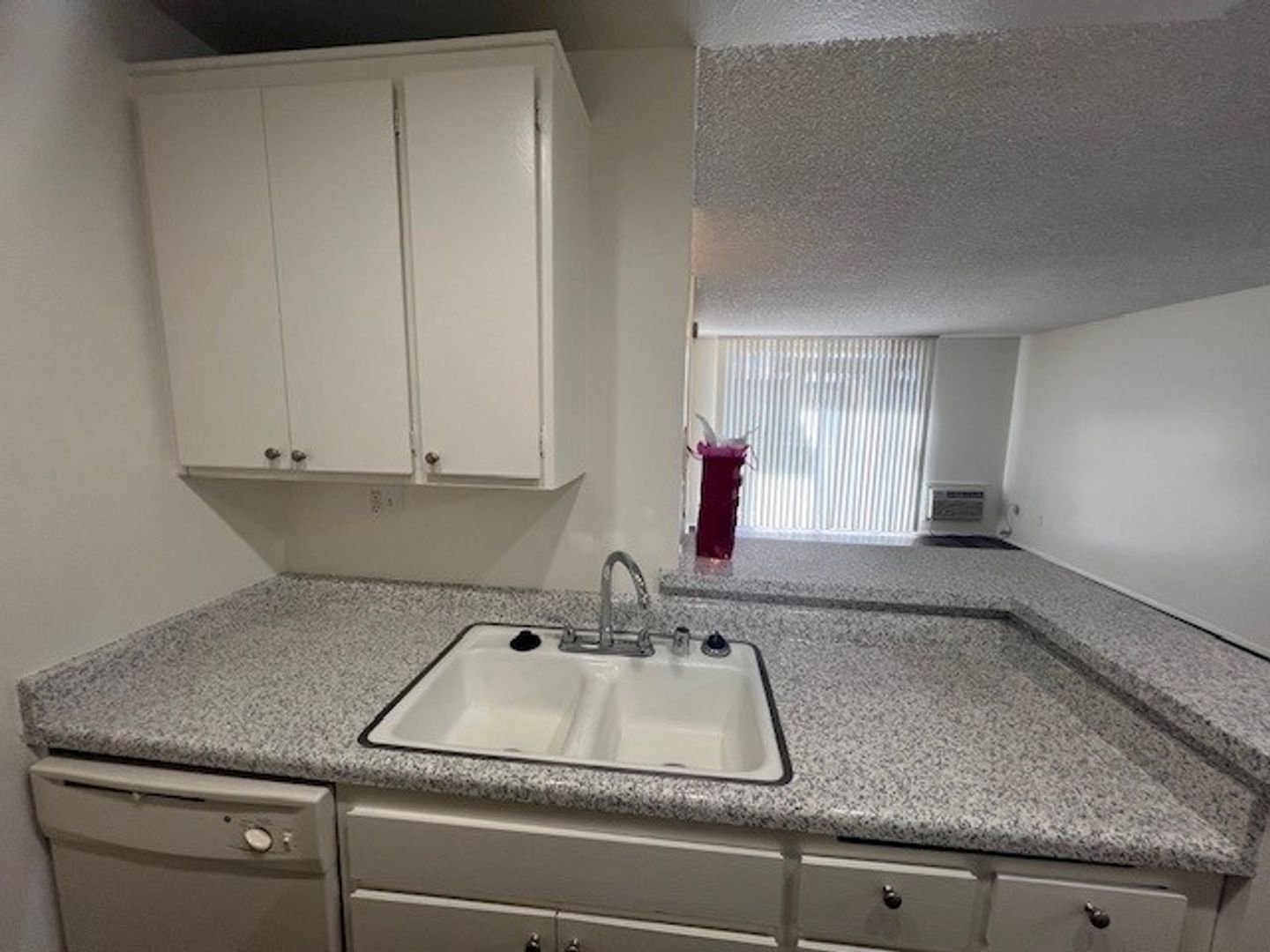 The kitchen includes a full-size stove, dishwasher, and ample cabinet space. The bedroom features a walk-in closet for convenient storage.